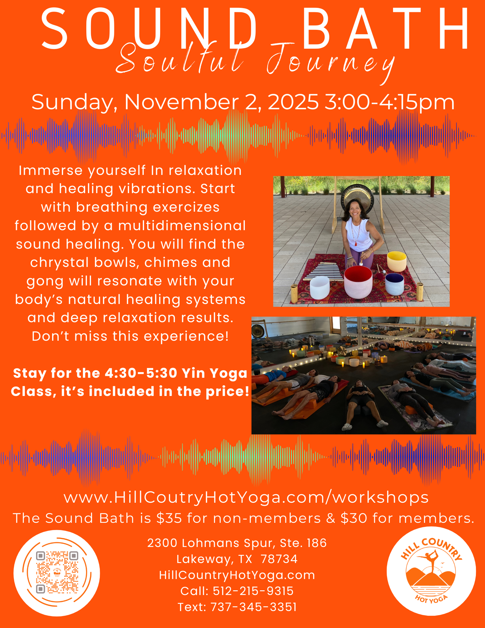 Join us for an afternoon immersed in relaxation and healing vibrations at Hill Country Hot Yoga. We begin with breathing exercises in preparation for deep rest. Then Audra will take you into multidimensional sound healing by merging her voice with vibrations from the Quartz crystal bowls, chimes, and gong to activate your body’s natural healing systems.